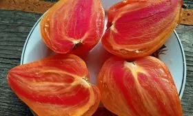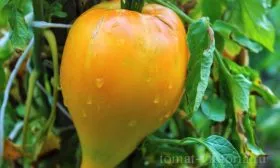 Форма плода сердцевидная с четко выраженным заостренным кончиком («носиком»). Такая форма, характерная для многих биф-томатов, часто приводит к неодномерности плодов на одном кусте. Самые крупные, массой до 350 граммов и более, завязываются на нижних кистях. Плоды на верхних ярусах, как правило, мельче, но их формируется больше.