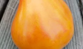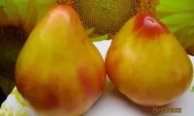 Главная отличительная черта сорта — сложная окраска зрелых плодов. Основной цвет — оранжево-желтый, но на нем проявляются розовые размытые пятна («щечки») и часто более темная «шапочка» у плодоножки. Эта особенность делает плоды очень нарядными. Степень проявления румянца напрямую зависит от количества солнечного света, попадающего непосредственно на томат.
