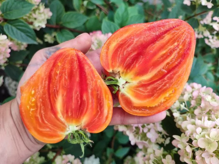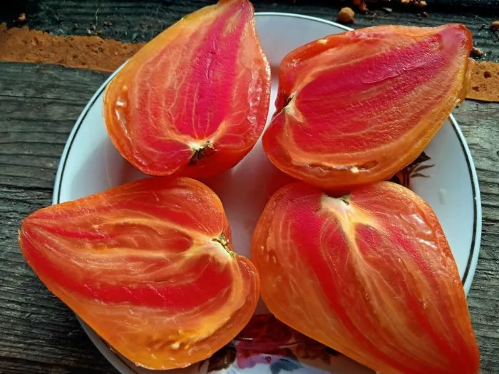 Плоды отличаются высокой мясистостью и так называемой маслянистой структурой мякоти. Внутри практически нет семенных камер и пустот, что характерно для современных биф-томатов. Именно эта плотная, сахаристая на изломе мякоть обеспечивает насыщенный вкус.