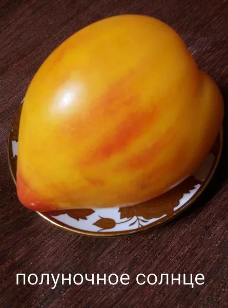 Романтичное название «Полуночное солнце» напрямую отсылает к его главной отличительной черте. Зрелый плод имеет не однотонный окрас, а эффектный градиент: основной оранжево-желтый фон в области плодоножки плавно переходит в насыщенно-розовую «шапочку» и «щечки». Подобная игра цвета не случайна и свидетельствует о богатом биохимическом составе, где сочетаются каротиноиды (оранжевые пигменты) и ликопин (красный пигмент).