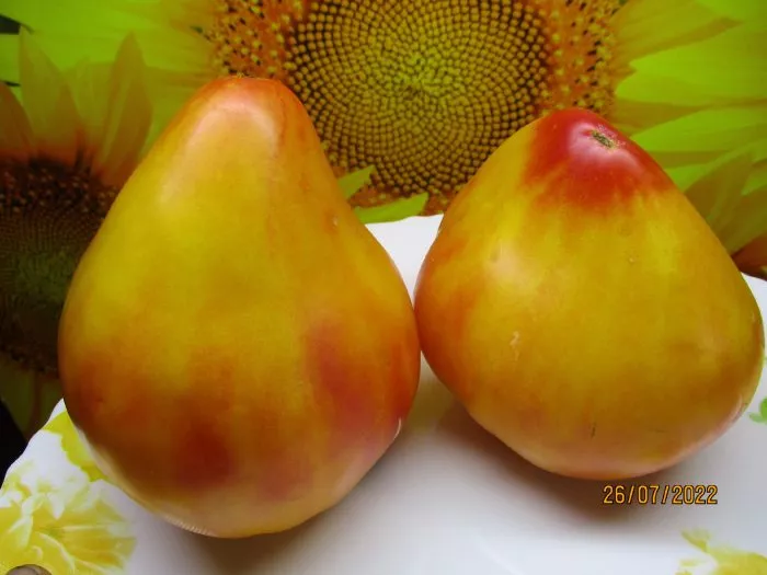 Главная отличительная черта сорта — сложная окраска зрелых плодов. Основной цвет — оранжево-желтый, но на нем проявляются розовые размытые пятна («щечки») и часто более темная «шапочка» у плодоножки. Эта особенность делает плоды очень нарядными. Степень проявления румянца напрямую зависит от количества солнечного света, попадающего непосредственно на томат.