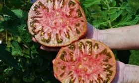 Плоды имеют классическую плоскоокруглую, бифштексную форму. Они заметно приплюснуты у вершины и основания, а у плодоножки часто проявляется выраженная ребристость. Мякоть многокамерная, сочная, с небольшим количеством семян.