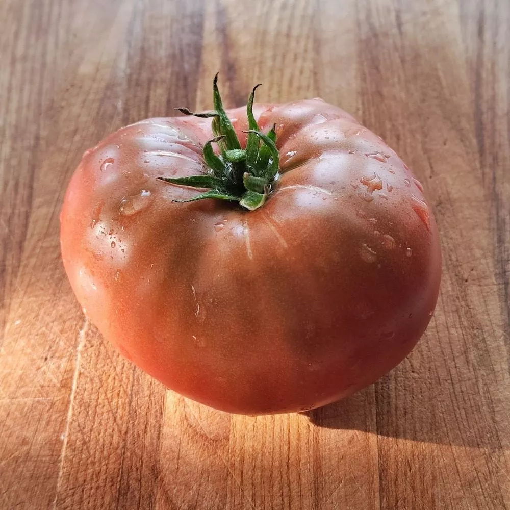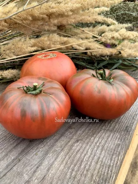 Плоды имеют классическую плоскоокруглую, бифштексную форму. Они заметно приплюснуты у вершины и основания, а у плодоножки часто проявляется выраженная ребристость. Мякоть многокамерная, сочная, с небольшим количеством семян.