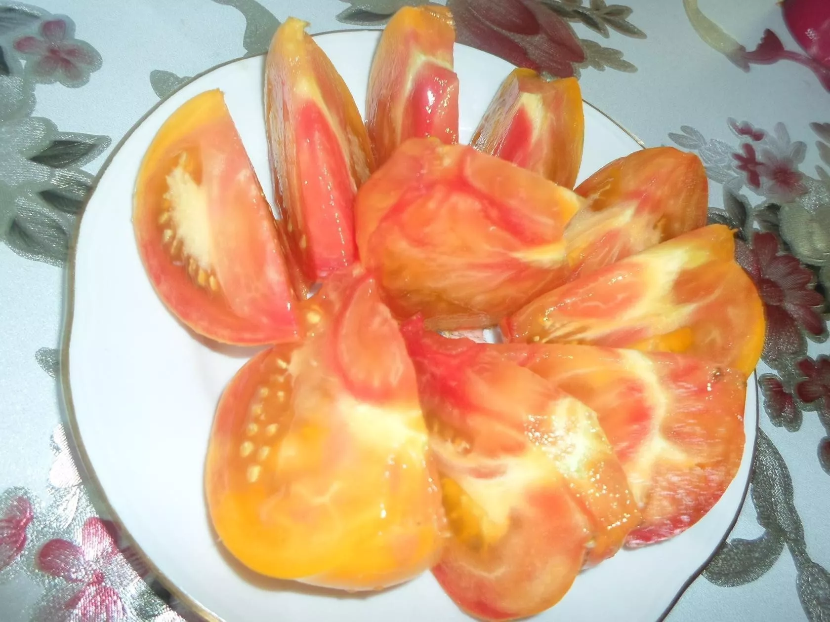 Главная отличительная черта — сложная окраска. Основной фон зрелого плода — теплый желто-оранжевый. По нему неравномерно, будто мазками, распределены красные и розовые полосы и разводы. Эта пестрота — не недостаток, а стабильный сортовой признак. Интенсивность красного «румянца» может варьироваться в зависимости от освещения и температуры.