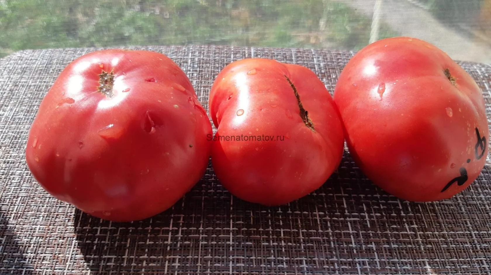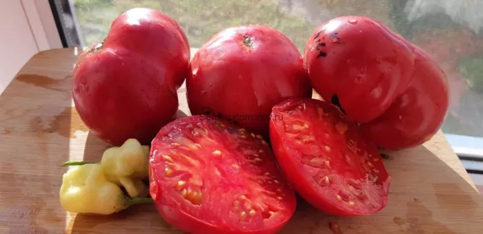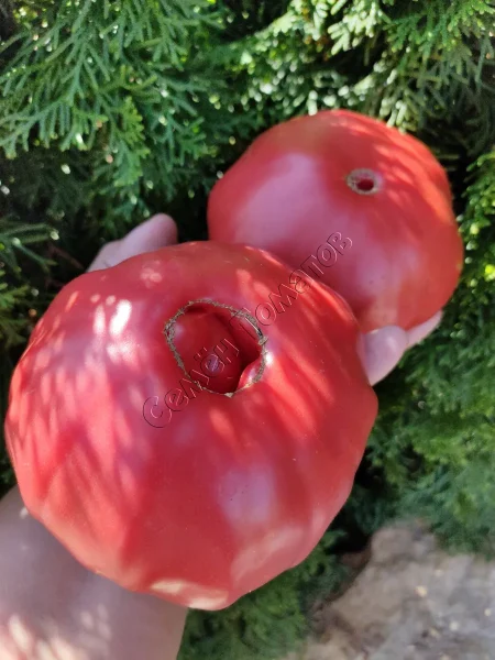 В состоянии технической спелости плоды светло-зеленые, без темного пятна у плодоножки. Полное созревание характеризуется насыщенным темно-розовым цветом. Мякоть очень мясистая, сахарная на изломе, с малым количеством семян и многокамерная.