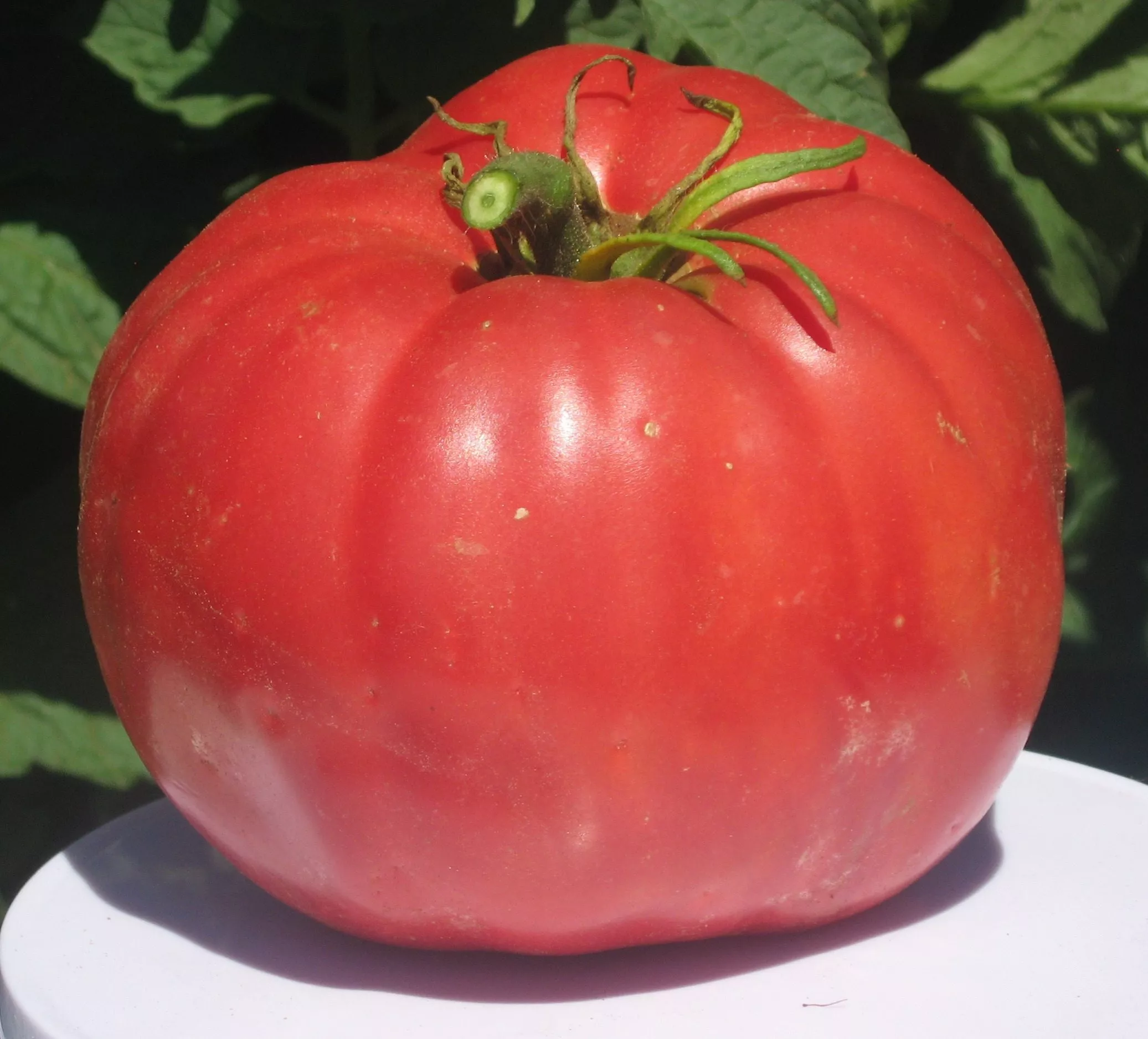 Главная гордость сорта – его плоды, полностью оправдывающие название «монстр». Масса варьируется от 500 до 1500 граммов. Первые завязи на нижних кистях, как правило, самые крупные. Форма плоскоокруглая, часто с выраженной ребристостью у плодоножки.