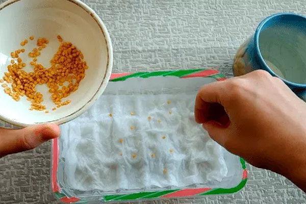 - Проращивание. Выложите зёрна на смоченную марлю и обеспечьте им температуру +22…+25°C. Через 1-2 дня проклюнувшиеся экземпляры готовы к посеву.