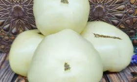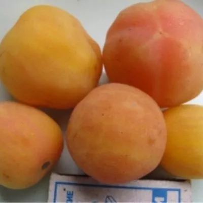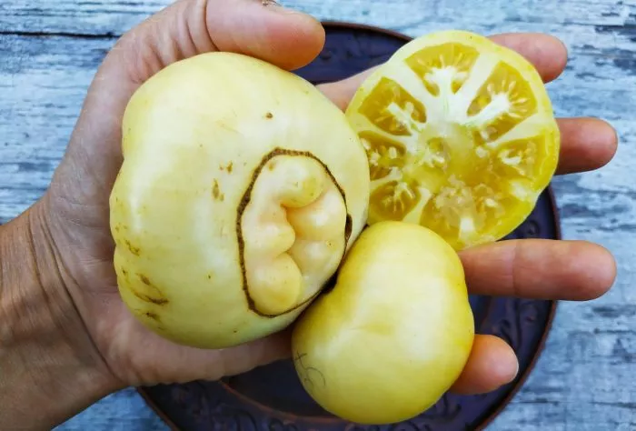 Главная отличительная черта сорта — его плоды. При полном созревании они приобретают редкий светло-желтый окрас, который часто описывают как кремовый, персиковый или цвет слоновой кости. Форма соответствует указанной плоскоокруглой, часто с заметной слабой ребристостью в области плодоножки.