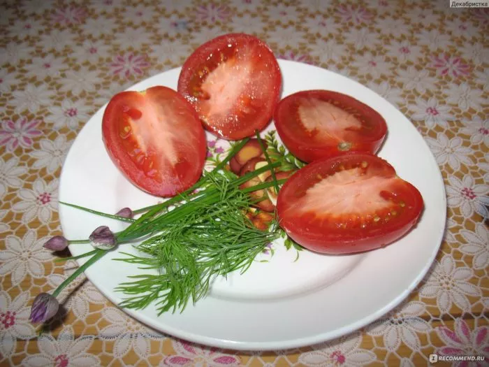 Цвет зрелого плода — классический насыщенно-красный, без зеленого пятна у плодоножки. Мякоть плотная, сочная, с хорошим классическим томатным вкусом. Кожица прочная, но не грубая, что предохраняет плоды от растрескивания, особенно при соблюдении стабильного полива.