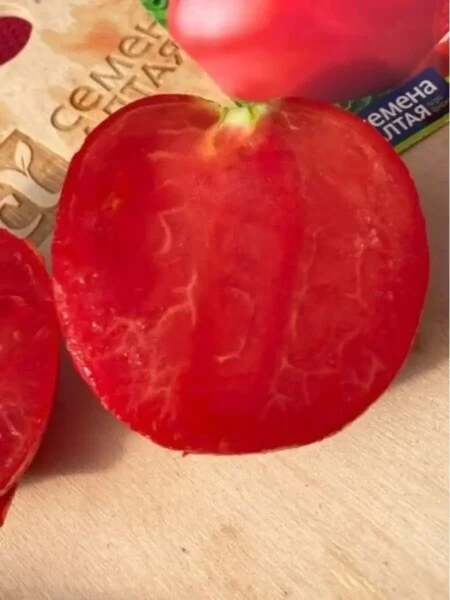 Плоды крупные, их масса соответствует заявленному диапазону в 180-220 граммов. Такие томаты считаются мясистыми (биф-томатами). Кожица у них плотная, но не жесткая, что является ключевым фактором: она обеспечивает хорошую устойчивость к растрескиванию при перепадах влажности почвы, но при этом не ощущается при употреблении в свежем виде.