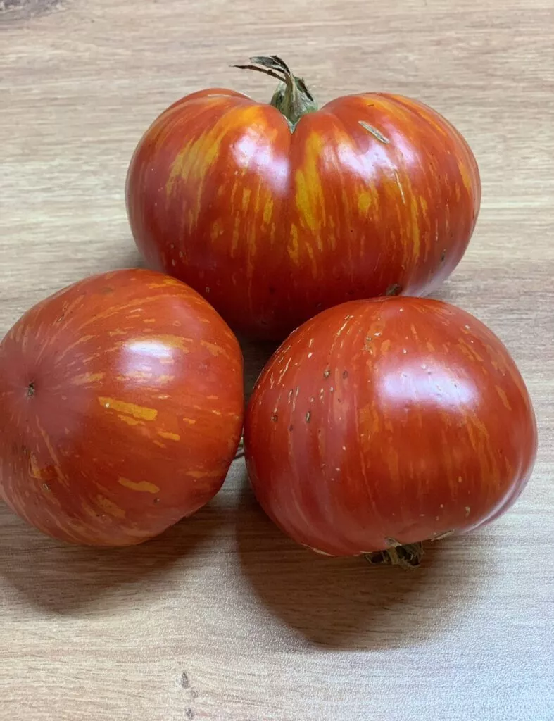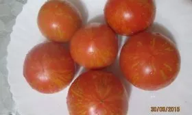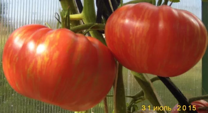 Плоды — главная декоративная и вкусовая ценность сорта. Их уникальная окраска является генетическим признаком. Основной фон зрелого томата — глубокий красный. На нем, не смешиваясь, проявляются продольные полосы и разводы оранжевого и желто-зеленоватого оттенков. Этот эффект наиболее ярко выражен у плодов, созревающих под прямыми солнечными лучами.