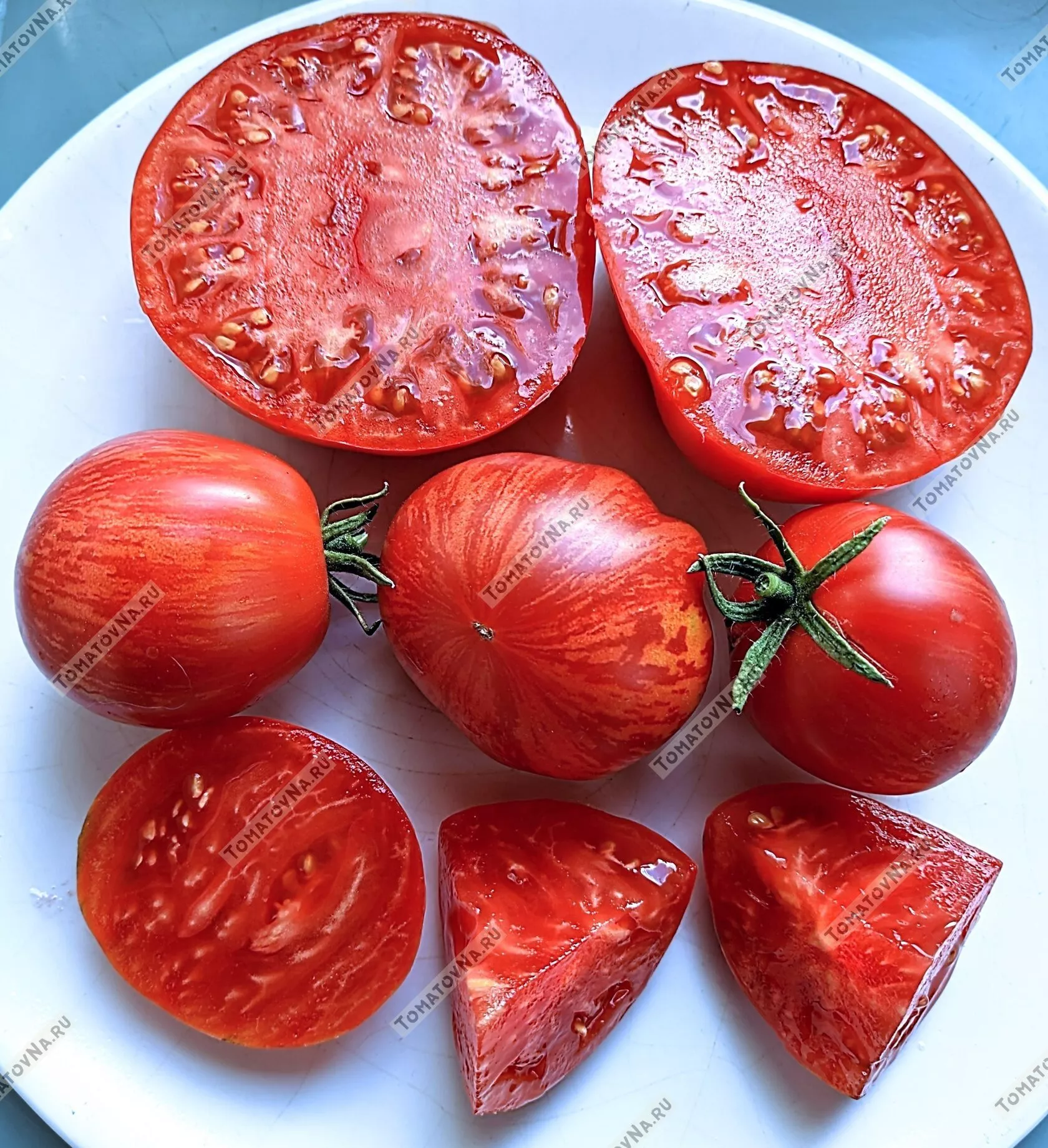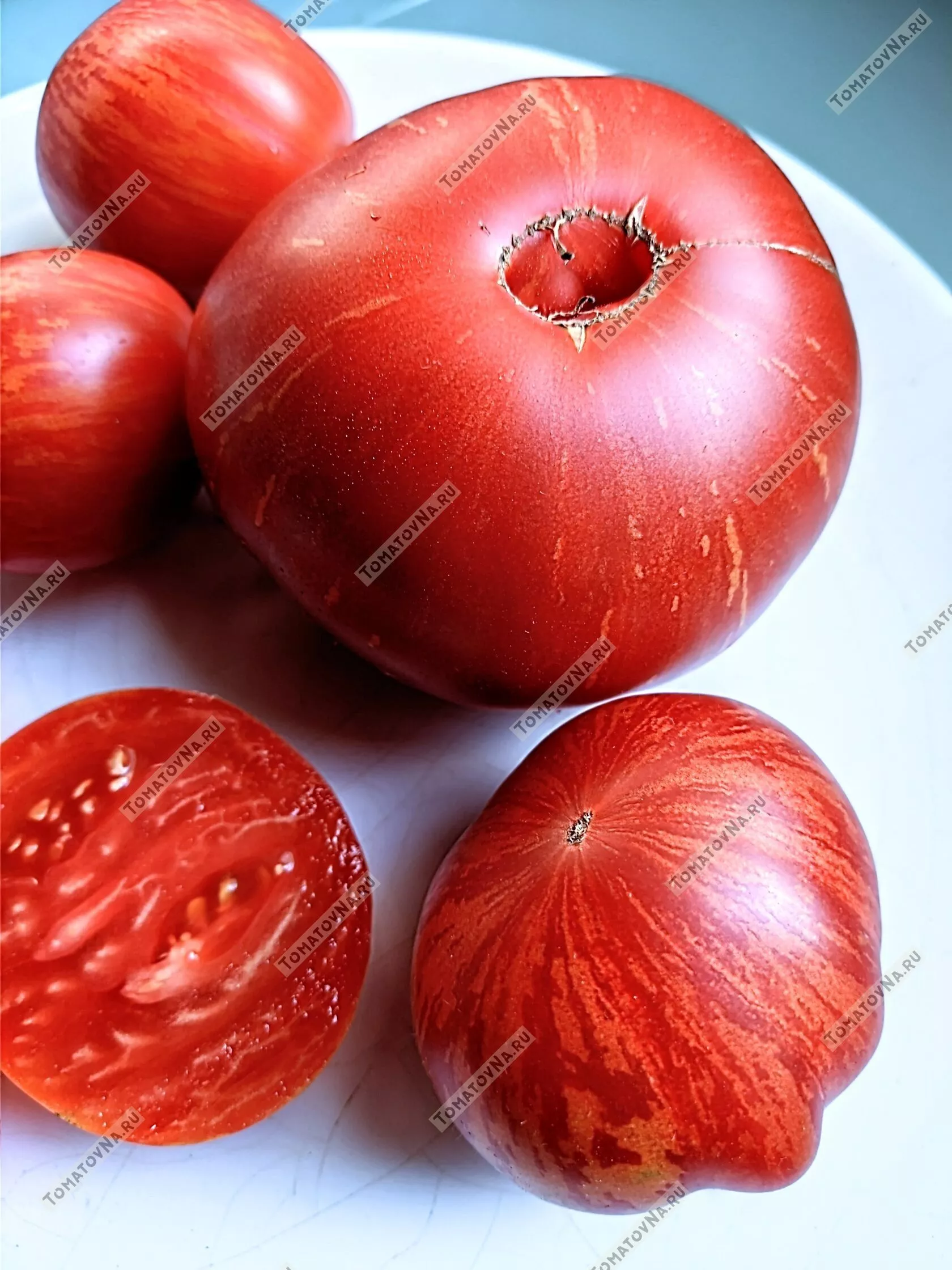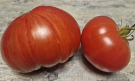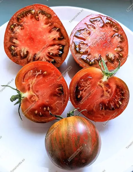 Форма преимущественно округлая или сердцевидная, часто с легкой ребристостью у плодоножки. Плоды многокамерные, с мясистой, плотной, но нежной мякотью и небольшим количеством семян. Такая структура, характерная для многих биф-томатов, обеспечивает не только отличный вкус, но и хорошую транспортабельность.