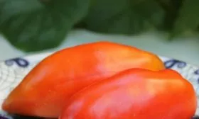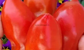 Именно плоды делают сорт узнаваемым. Их форма описывается как удлиненная перцевидная сливка с обязательным острым сосочком на вершине. Эта деталь — не случайность, а стабильный сортовой признак. Плоды не округлые и не приплюснутые, а именно вытянутые, часто с легкой ребристостью у плодоножки, что и отражено в названии сорта.