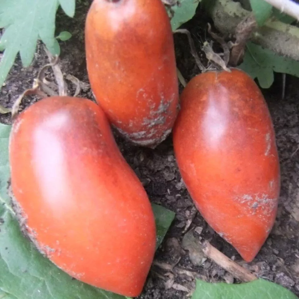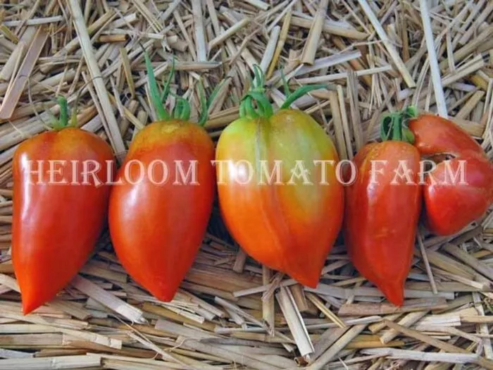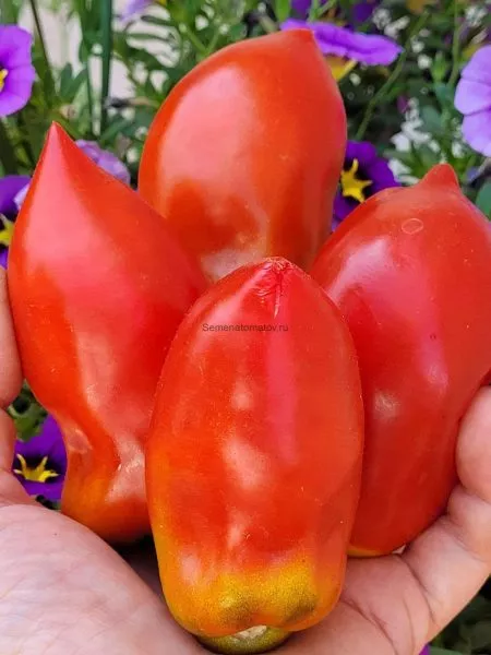 Форма плода — вытянутая перцевидная сливка с выраженным сосочком на вершине — выделяет его среди классических круглых или плоскоокруглых томатов. Такая форма не только декоративна, но и практична: плоды удобно консервировать целиком, они плотно укладываются в банку.