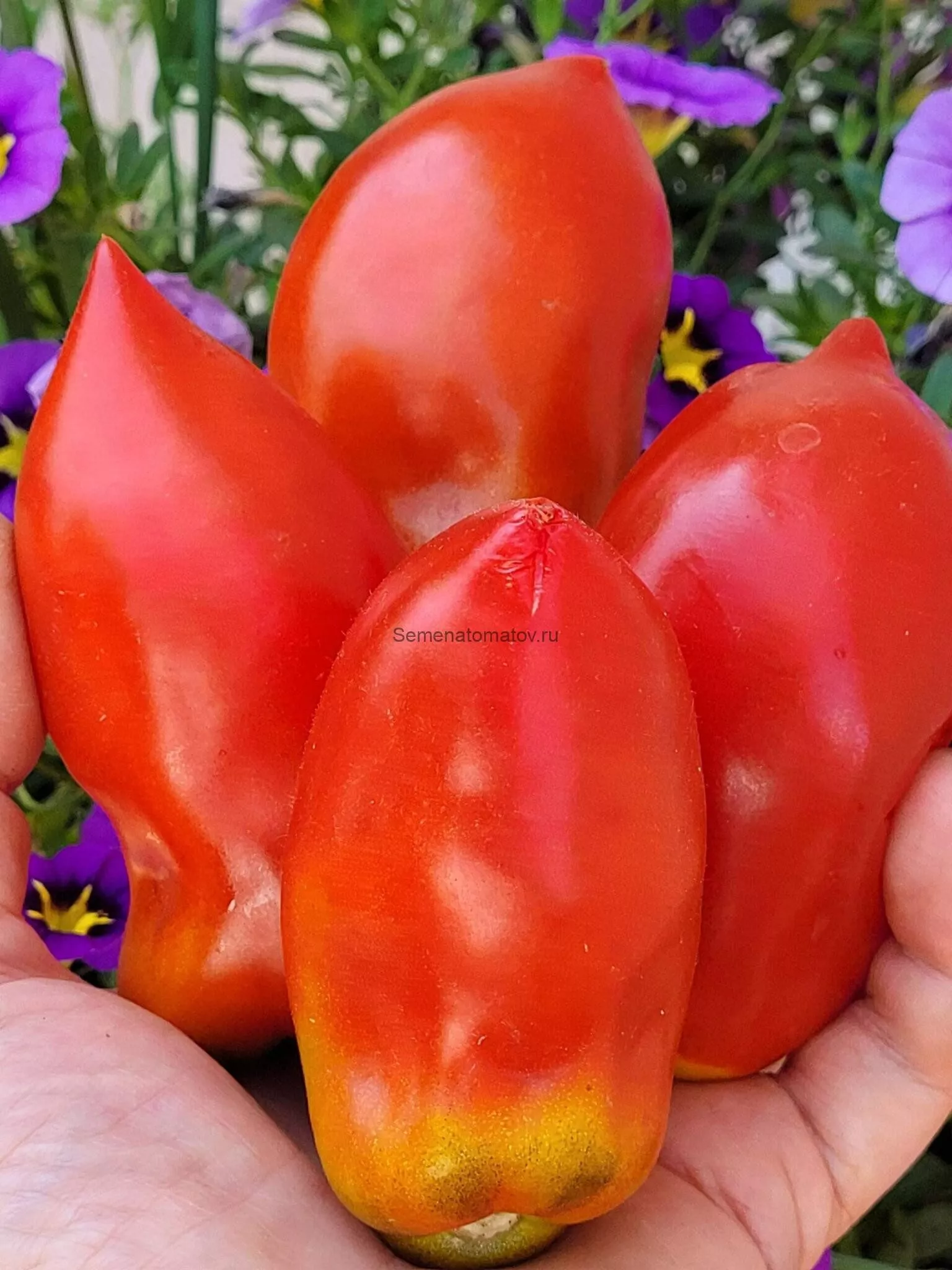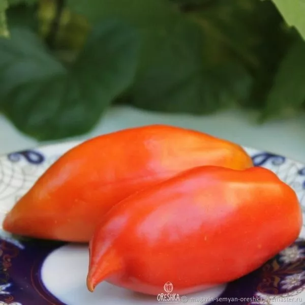 Именно плоды делают сорт узнаваемым. Их форма описывается как удлиненная перцевидная сливка с обязательным острым сосочком на вершине. Эта деталь — не случайность, а стабильный сортовой признак. Плоды не округлые и не приплюснутые, а именно вытянутые, часто с легкой ребристостью у плодоножки, что и отражено в названии сорта.