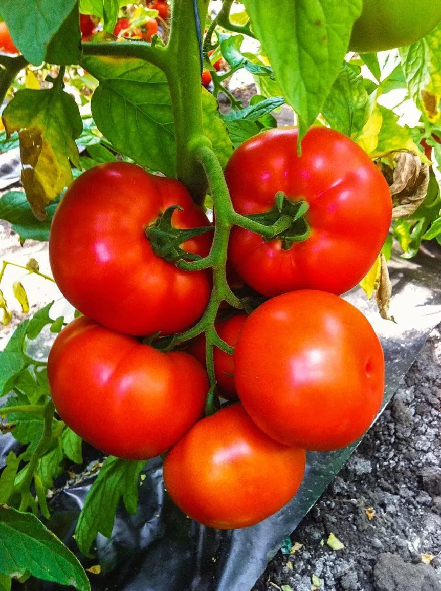 Листовая пластина крупная, классической «томатной» формы, окрашена в темно-зеленый цвет. Стебель крепкий, но без надежной вертикальной опоры не выдержит нагрузки от многочисленных крупных плодов. Уже на ранних этапах роста необходимо установить систему подвязки, так как полегание куста резко повышает риск заболеваний и ухудшает качество урожая.