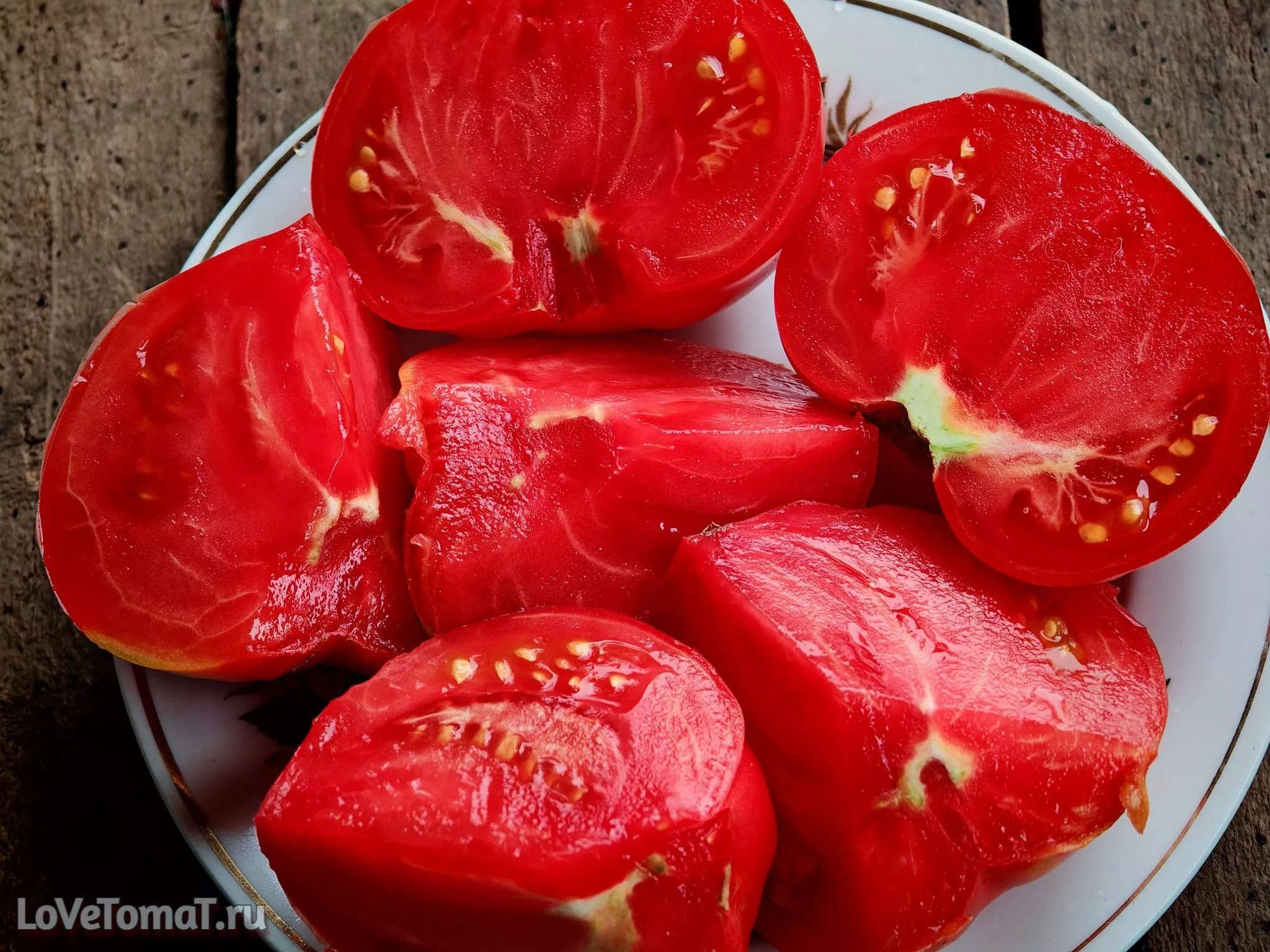 При полном созревании кожица и мякоть приобретают насыщенный малиново-красный оттенок. Такой цвет свидетельствует о высоком содержании ликопина — мощного антиоксиданта. Мякоть исключительно мясистая, плотная и сахаристая на изломе, с минимальным количеством семян и небольшими семенными камерами. Подобную структуру в агрономической практике принято называть бифштексной.