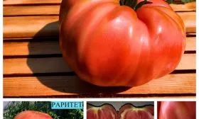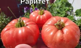 Форма плоско-округлая, с заметной ребристостью в области плодоножки. Эта ребристость — типичный признак сортов типа «биф» (beefsteak), к которым относится и Раритет. Полностью созревшие томаты приобретают равномерный, насыщенный розовый цвет без зеленого пятна у плодоножки.
