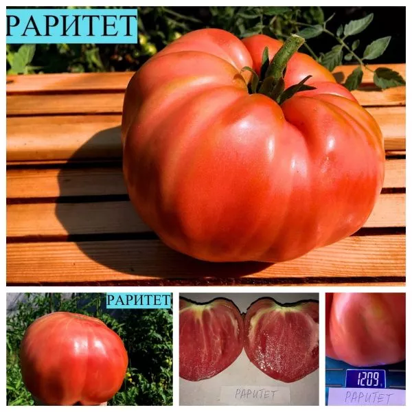 Форма плоско-округлая, с заметной ребристостью в области плодоножки. Эта ребристость — типичный признак сортов типа «биф» (beefsteak), к которым относится и Раритет. Полностью созревшие томаты приобретают равномерный, насыщенный розовый цвет без зеленого пятна у плодоножки.