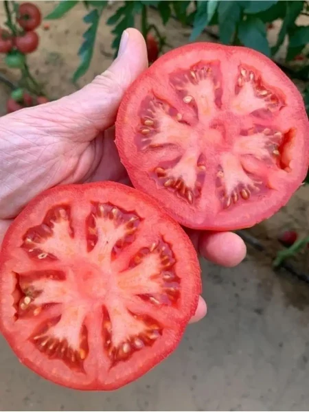 Мякоть многокамерная, очень плотная и сахаристая на излом, с небольшим количеством семян. Вкусовые качества соответствуют заявленным как превосходные: вкус гармоничный, насыщенно-сладкий с легкой, сбалансированной кислинкой, что характерно для качественных розовоплодных томатов.
