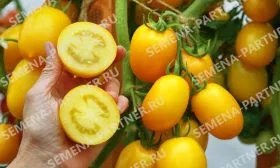 Плоды завязываются кистями. Благодаря детерминантному характеру роста и среднерослости, основная масса урожая формируется дружно, что является преимуществом для консервации и переработки. Растение выглядит очень декоративно в период полного созревания, когда на фоне зеленой листвы одновременно созревают кисти ярко-желтых плодов.