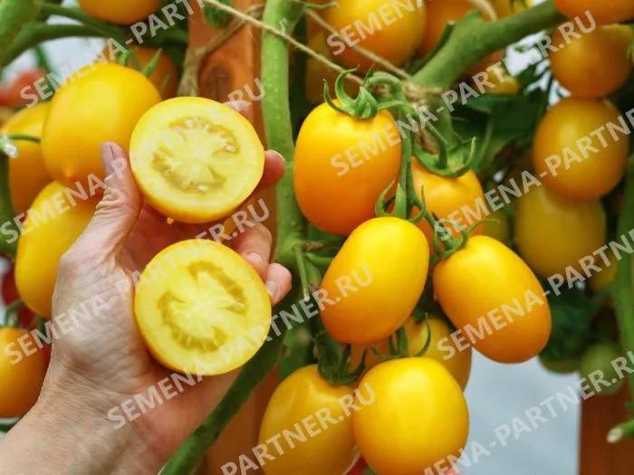 Плоды завязываются кистями. Благодаря детерминантному характеру роста и среднерослости, основная масса урожая формируется дружно, что является преимуществом для консервации и переработки. Растение выглядит очень декоративно в период полного созревания, когда на фоне зеленой листвы одновременно созревают кисти ярко-желтых плодов.