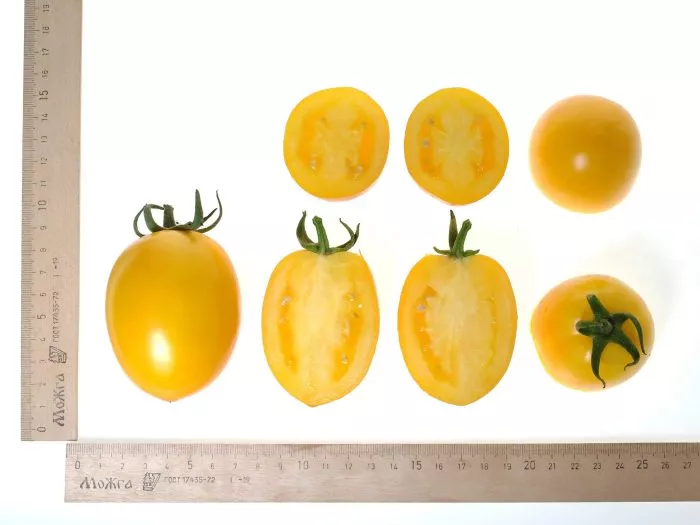 В технической спелости плоды светло-зеленые, без темного пятна у плодоножки. По мере созревания они равномерно окрашиваются в насыщенный ярко-желтый цвет. Масса каждого томата стабильна и составляет 70-110 граммов. Плоды в кисти и на всем кусте выровнены по размеру, что является признаком высокой товарности и удобства при переработке.