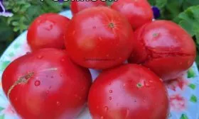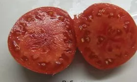 Плоды имеют плоско-округлую, слегка ребристую форму, характерную для биф-томатов (крупноплодных мясистых томатов). Их главная отличительная черта — ярко-малиновый цвет зрелой кожицы, который сигнализирует о высоком содержании ликопина и сахаров. Мякоть многокамерная, очень плотная и мясистая, без пустот, с небольшим количеством семян.