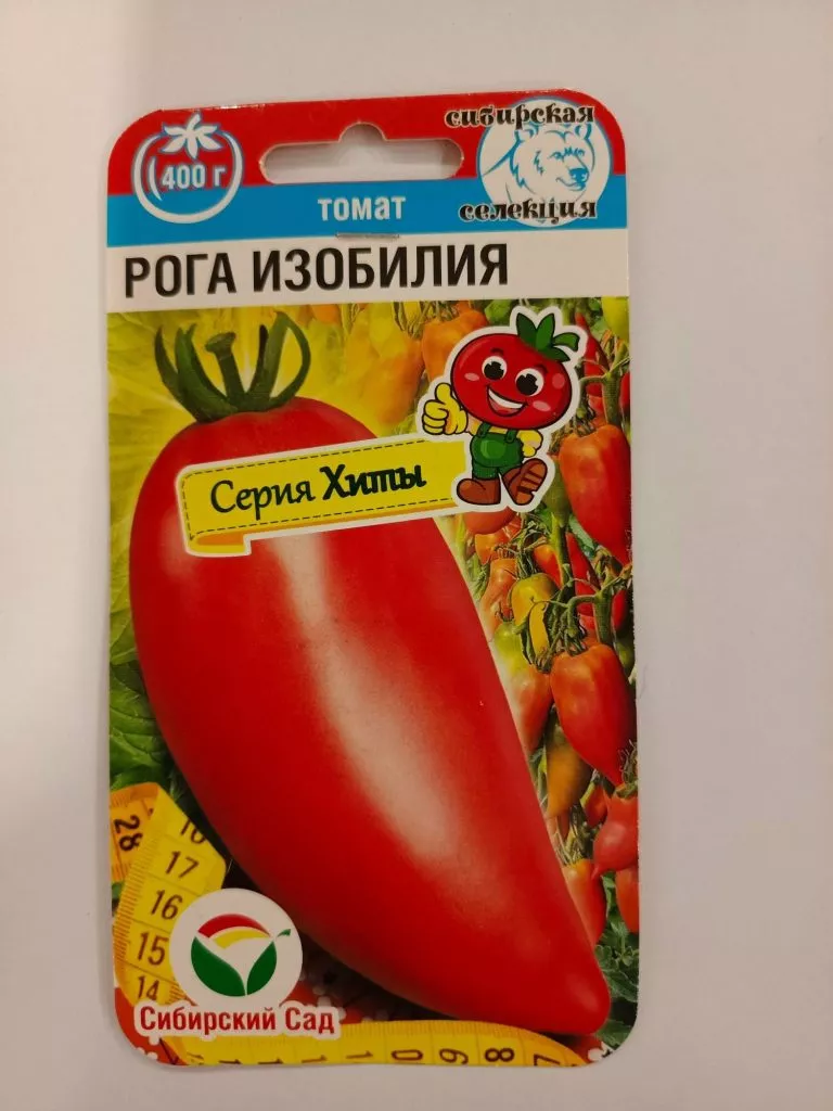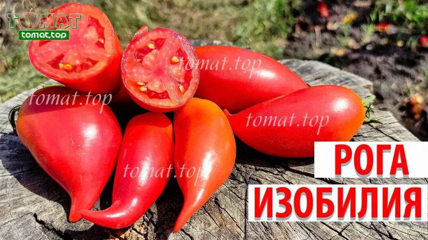 Название сорта «Рога Изобилия» дано не случайно и точно описывает его главную отличительную черту — форму плода. Помидоры имеют удлиненную, перцевидную форму с характерной загнутой и заостренной верхушкой, что визуально напоминает рог. Эта особенность является стабильным сортовым признаком.
