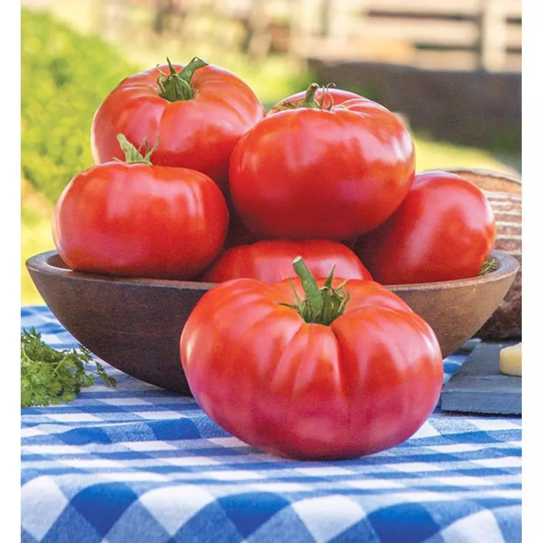 Плоды формируются в простых или промежуточных кистях, обычно по 5-7 штук. Их плоскоокруглая форма — одна из визитных карточек сорта. Она отличается от идеально круглой слегка приплюснутыми полюсами и часто слабо выраженной ребристостью в области плодоножки. Эта форма не только узнаваема, но и практична: такие томаты устойчиво лежат на поверхности и удобно размещаются в таре для консервирования.
