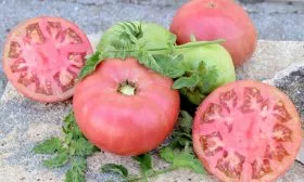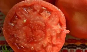 Форма плодов округлая, но часто переходит в плоско-округлую или слегка ребристую у плодоножки, что и указано в характеристиках как «округлая до неправильной». Это не брак, а сортовой признак, характерный для многих крупноплодных розовых томатов. Часто ребристость более выражена у самых крупных экземпляров.