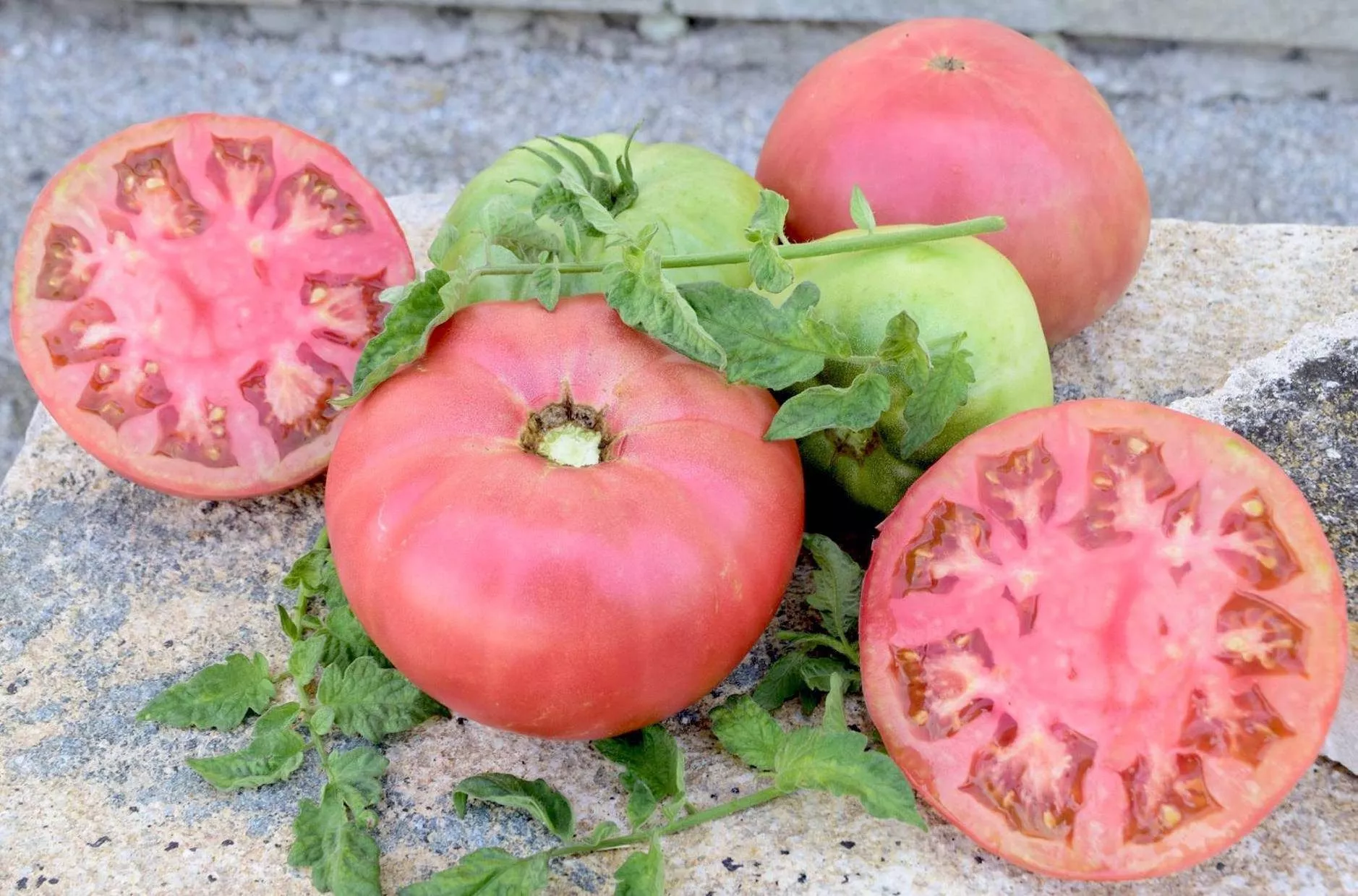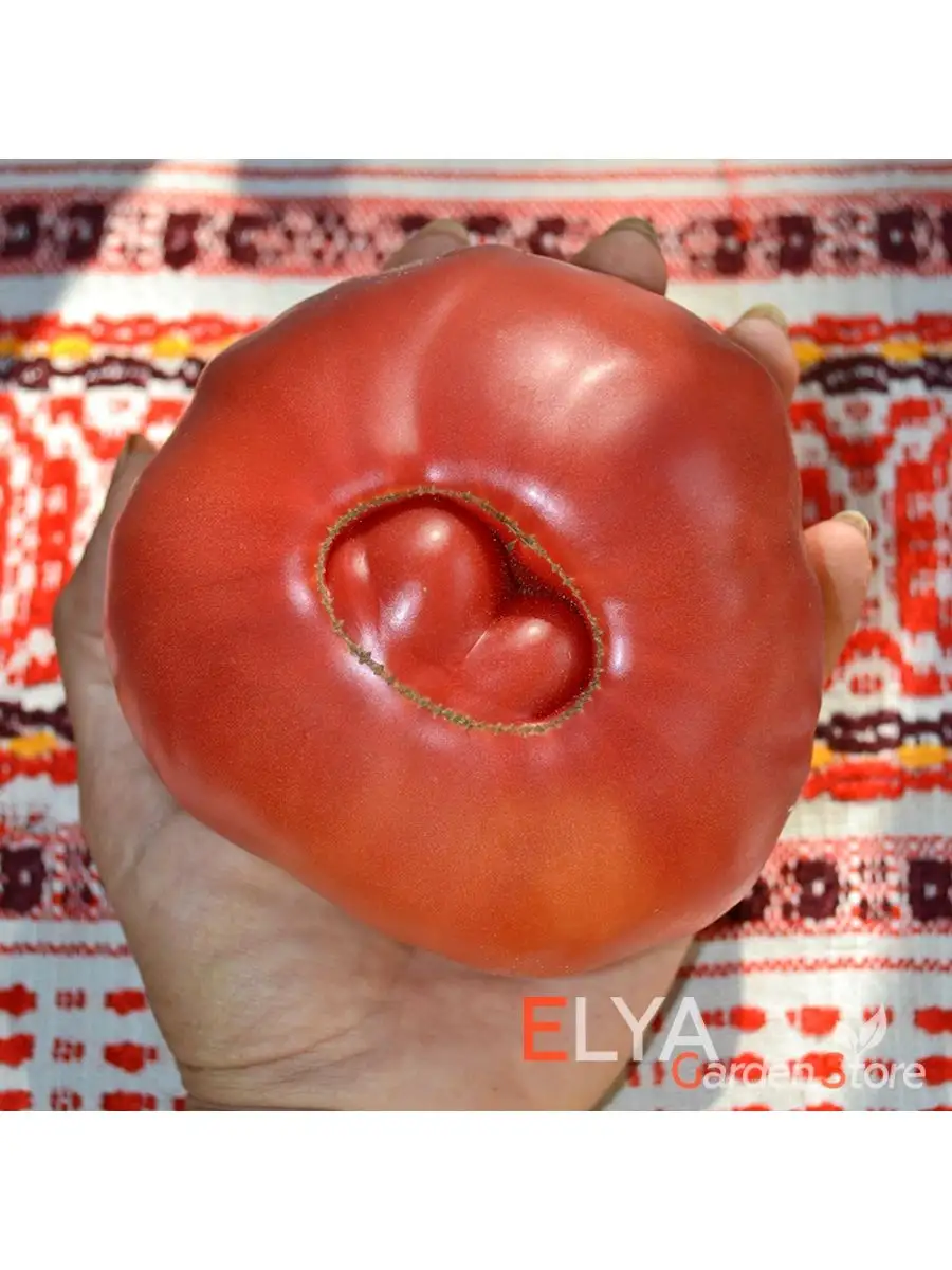 Форма плодов округлая, но часто переходит в плоско-округлую или слегка ребристую у плодоножки, что и указано в характеристиках как «округлая до неправильной». Это не брак, а сортовой признак, характерный для многих крупноплодных розовых томатов. Часто ребристость более выражена у самых крупных экземпляров.