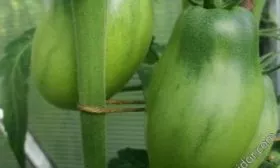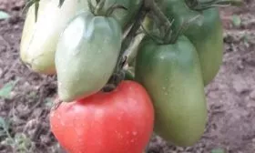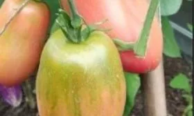 Плоды имеют узнаваемую удлиненную, перцевидную форму, часто с заостренным кончиком-«носиком». В незрелом состоянии у плодоножки наблюдается темно-зеленое пятно, которое по мере созревания полностью исчезает. Зрелый томат окрашивается в равномерный розово-малиновый цвет без зеленого пятна у основания.