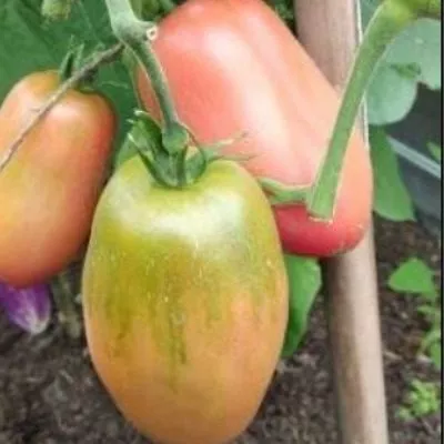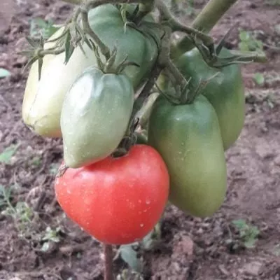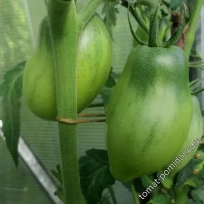 Плоды имеют узнаваемую удлиненную, перцевидную форму, часто с заостренным кончиком-«носиком». В незрелом состоянии у плодоножки наблюдается темно-зеленое пятно, которое по мере созревания полностью исчезает. Зрелый томат окрашивается в равномерный розово-малиновый цвет без зеленого пятна у основания.