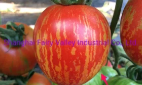 Главная отличительная черта сорта — экзотическая окраска плодов. В процессе созревания она динамично меняется. Изначально светло-зеленые с темно-зелеными полосами, томаты постепенно набирают розовый цвет, в то время как полосы сохраняют насыщенный зеленый оттенок, создавая эффектный «зебровый» контраст.