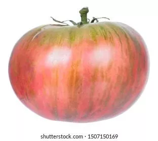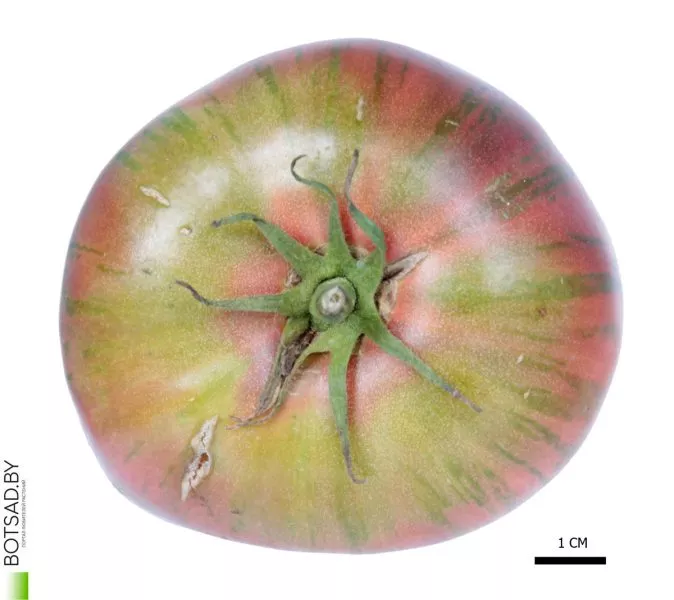 Главная отличительная черта сорта — экзотическая окраска плодов. В процессе созревания она динамично меняется. Изначально светло-зеленые с темно-зелеными полосами, томаты постепенно набирают розовый цвет, в то время как полосы сохраняют насыщенный зеленый оттенок, создавая эффектный «зебровый» контраст.