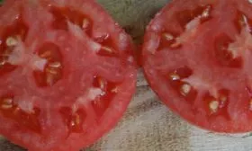 На разломе видна мясистая, сахаристая и очень сочная мякоть. Плод многокамерный, но семенных гнезд немного, а сами семена некрупные. Высокое содержание сухих веществ и сахаров в мякоти формирует яркий сладкий вкус с гармоничной, едва уловимой кислинкой, характерный для качественных розовоплодных томатов.