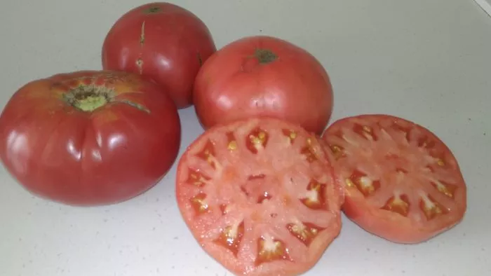 На разломе видна мясистая, сахаристая и очень сочная мякоть. Плод многокамерный, но семенных гнезд немного, а сами семена некрупные. Высокое содержание сухих веществ и сахаров в мякоти формирует яркий сладкий вкус с гармоничной, едва уловимой кислинкой, характерный для качественных розовоплодных томатов.