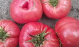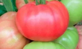 Плоды имеют плоскоокруглую, иногда почти округлую форму. У плодоножки часто наблюдается небольшая ребристость, что является сортовым признаком, а не дефектом. В стадии полной биологической зрелости томаты приобретают равномерный насыщенный розовый цвет без зеленого пятна у плодоножки, что упрощает определение оптимального времени сбора.