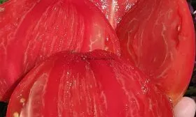 В стадии полной биологической спелости томаты приобретают равномерный, насыщенный малиново-розовый цвет. Зеленого пятна у плодоножки не остается, что указывает на полное созревание и накопление сахаров. Кожица тонкая, но плотная.