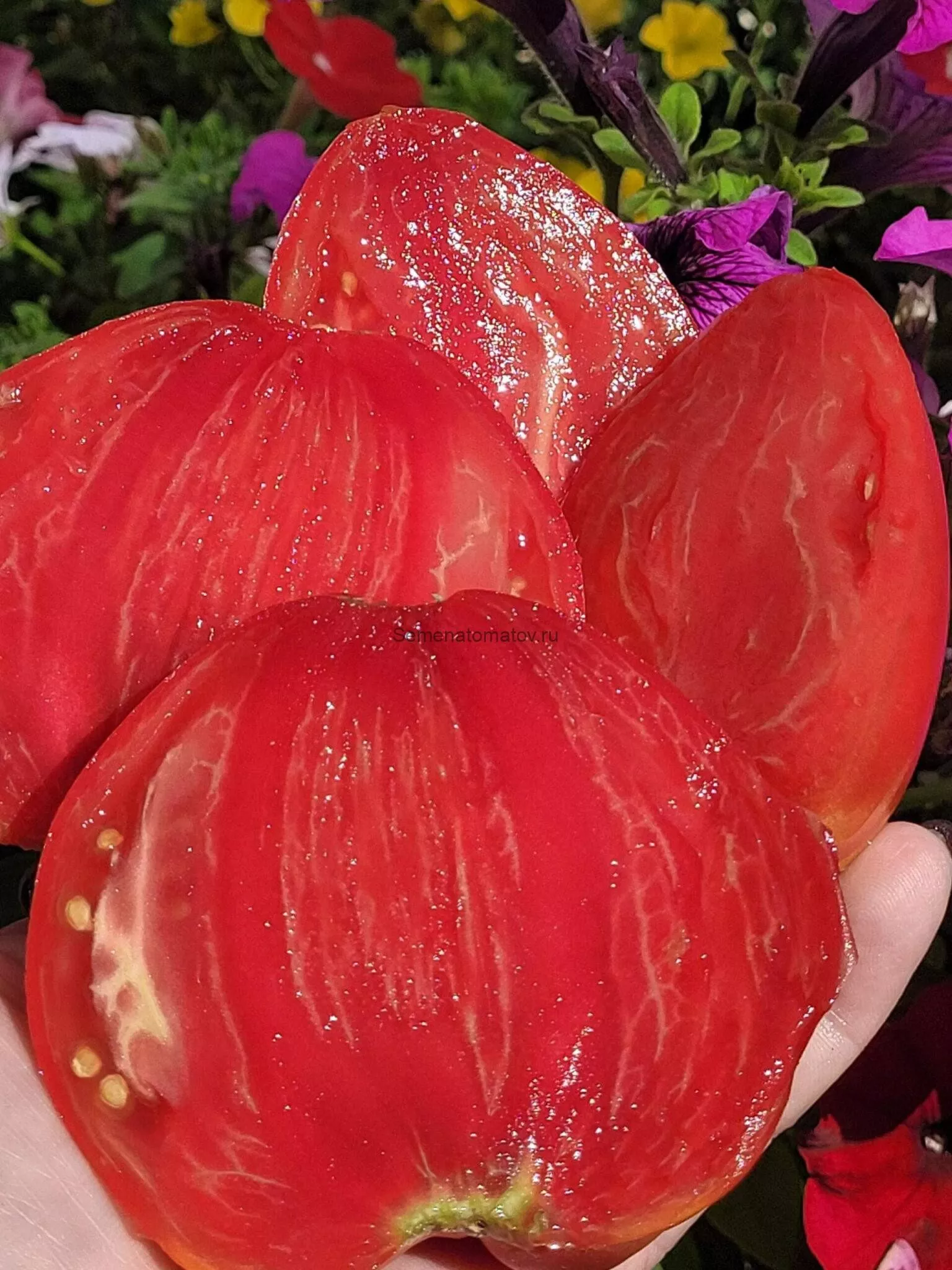 В стадии полной биологической спелости томаты приобретают равномерный, насыщенный малиново-розовый цвет. Зеленого пятна у плодоножки не остается, что указывает на полное созревание и накопление сахаров. Кожица тонкая, но плотная.
