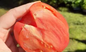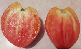 Мякоть зрелого плода многокамерная, очень сочная и мясистая, с минимальным количеством семян и практически без пустот. Тонкая, но плотная кожица предохраняет томаты от растрескивания при соблюдении равномерного полива, однако требует аккуратного обращения во время сбора урожая.