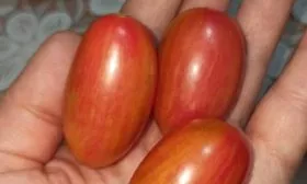 Форма и структура: Плоды имеют вытянутую сливовидную форму (обратнояйцевидную) с четко выраженным острым «носиком» на конце. Кожица плотная, глянцевая, что предотвращает растрескивание даже при перепадах влажности.