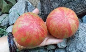 Многоцветный окрас. Зрелый томат имеет насыщенный малиново-розовый основной фон, по которому проходят причудливые разводы, штрихи и полосы кремово-желтого цвета. Этот рисунок, обусловленный генетически, не повторяется от плода к плоду, делая каждый экземпляр неповторимым. Стоит отметить, что плод окрашивается неравномерно и долго, особенно в области у плодоножки, поэтому полной зрелости стоит дождаться.