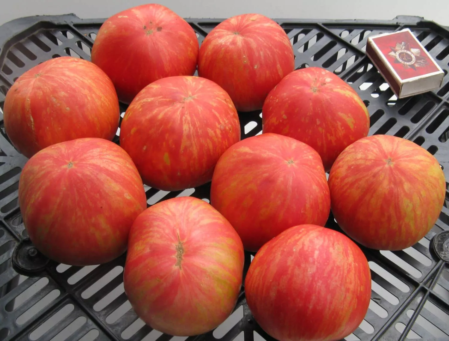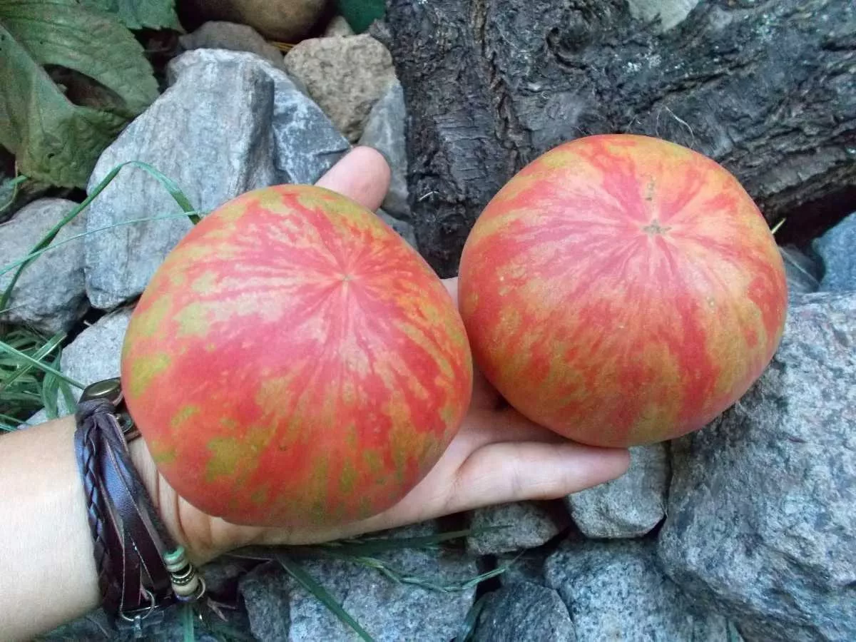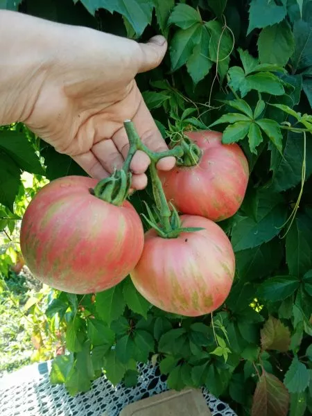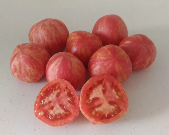 Многоцветный окрас. Зрелый томат имеет насыщенный малиново-розовый основной фон, по которому проходят причудливые разводы, штрихи и полосы кремово-желтого цвета. Этот рисунок, обусловленный генетически, не повторяется от плода к плоду, делая каждый экземпляр неповторимым. Стоит отметить, что плод окрашивается неравномерно и долго, особенно в области у плодоножки, поэтому полной зрелости стоит дождаться.