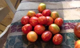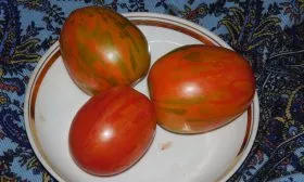 Яйцевидная форма, масса до 100 граммов, плотная мякоть и прочная, но не грубая кожица делают эти томаты практически идеальными для цельноплодного консервирования. Они не растрескиваются при термической обработке, сохраняют форму в маринадах и рассолах, а контрастные золотые полосы на красном фоне придают заготовкам нарядный, праздничный вид.