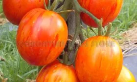 Главной отличительной чертой, выделяющей этот томат среди множества других, является его нестандартная расцветка. Зрелые плоды имеют красный основной фон, украшенный контрастными золотистыми или желтыми полосами. Такой окрас делает его высокодекоративным как на кусте, так и в овощных нарезках или консервации.