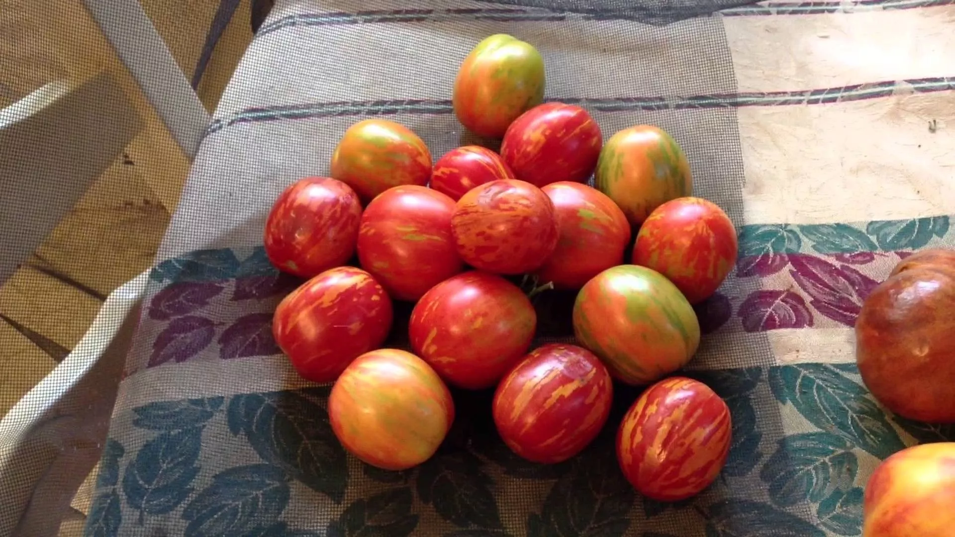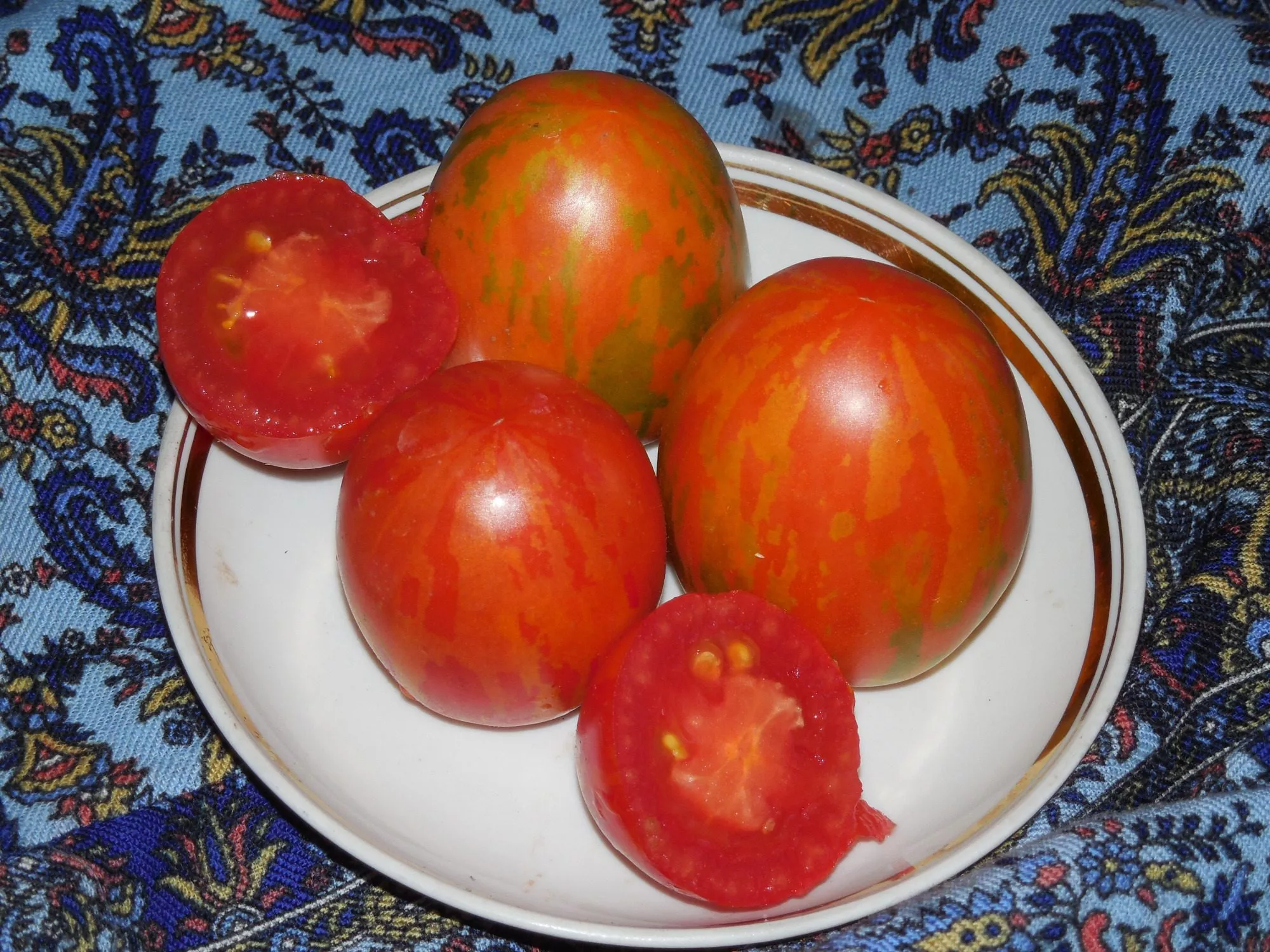 Яйцевидная форма, масса до 100 граммов, плотная мякоть и прочная, но не грубая кожица делают эти томаты практически идеальными для цельноплодного консервирования. Они не растрескиваются при термической обработке, сохраняют форму в маринадах и рассолах, а контрастные золотые полосы на красном фоне придают заготовкам нарядный, праздничный вид.