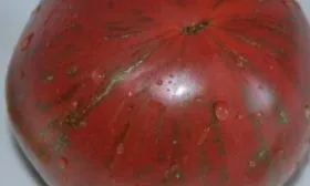 Полностью зрелый томат демонстрирует свой фирменный полосатый окрас. Важно понимать, что равномерного, однотонного окрашивания, как у классических розовых сортов, у Русского казака не происходит — пятнистость и полосатость являются его сортовой нормой.