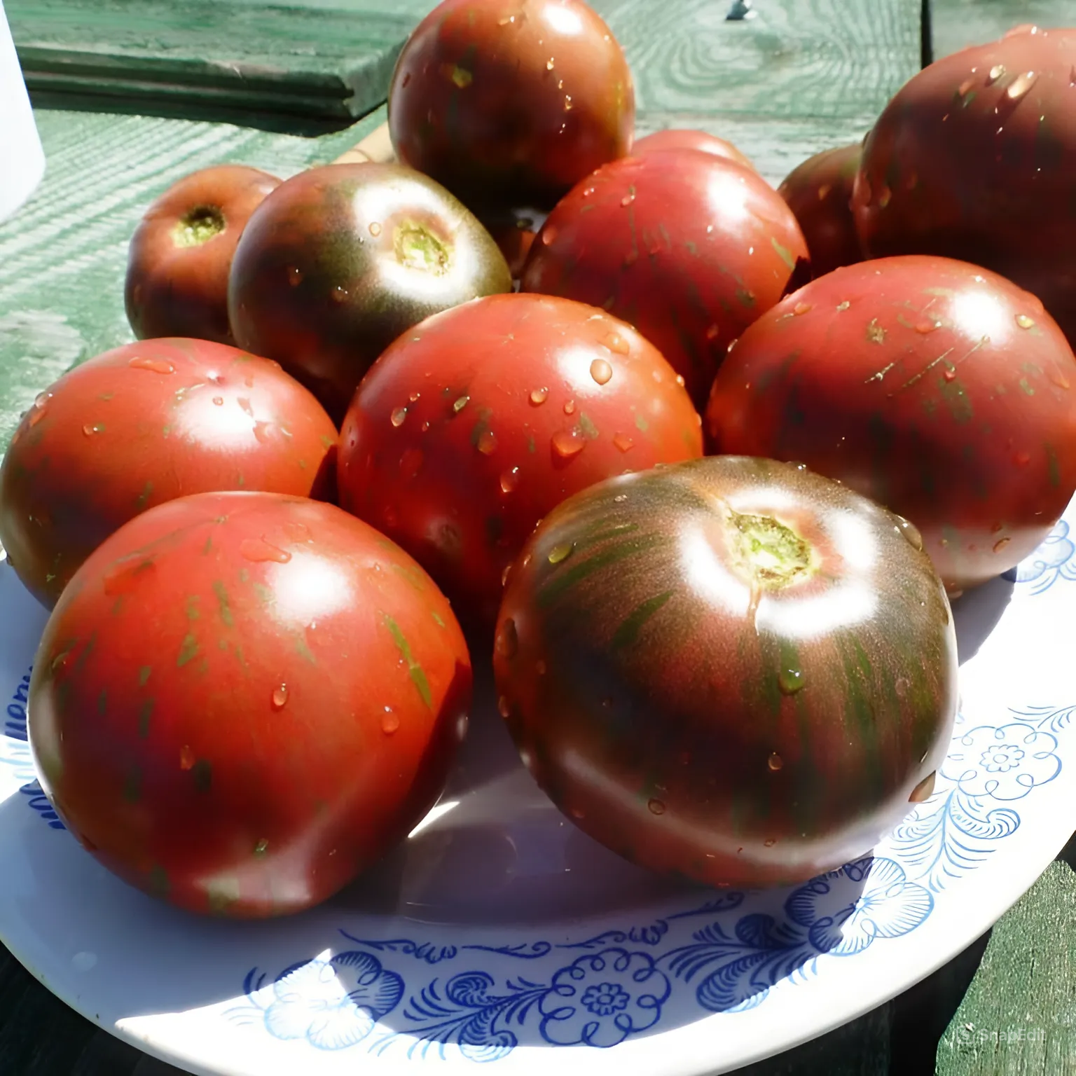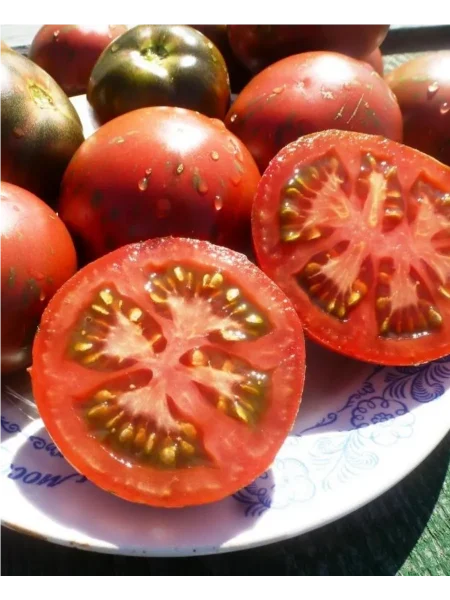Главная отличительная черта этого сорта — уникальная, «акварельная» окраска зрелых плодов. Она представляет собой сложную смесь розовых, зеленовато-желтых и сине-фиолетовых полос и разводов. Эта особенность делает плоды непохожими на большинство традиционных томатов и является результатом комбинации двух пигментов: ликопина (дает розовый цвет) и антоцианов (отвечают за сине-фиолетовые оттенки).